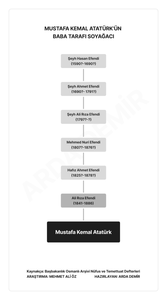 Osmanlı arşivinde, Atatürk’ün babası (Ali Rıza Efendi) tarafı ailesi ile ilgili olarak yapılan araştırmalarda Mustafa Kemal’in babası tarafı soyunun bilindiğinin aksine en az yedi nesil Selanikli oldukları anlaşılmıştır. Çünkü Selanik şehrine ait 16. Yüzyıl tapu tahrir defterleri, 17-19. Yüzyıla ait nüfus defterleri ve temettuat defterleri gibi birinci el kaynaklardaki kayıtlar bunu göstermektedir. Dolayısıyla Atatürk’ün babası Ali Rıza Efendi’nin ailesi tarafının 7 nesil Selanikli olduğunu kesin ve net olarak söylenebilir. Zaten Atatürk’ün kız kardeşi makbule Atadan’ın vermiş olduğu bilgiler de bu yöndedir.